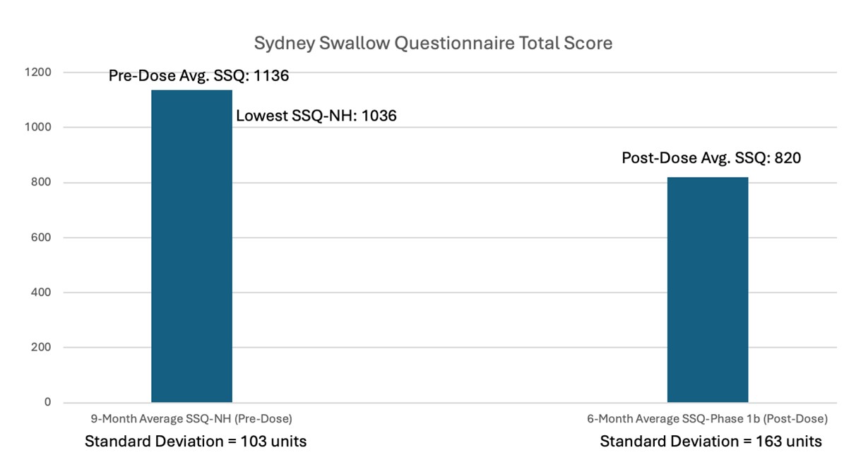 The Total Score recorded for the Subject-Reported SSQ also demonstrated continued reductions in the Subject’s dysphagic symptoms (i.e., improvements in the Subject’s ability to swallow) at the 180-day post-dose timepoint, with the Total SSQ Score continuing to decline and remaining meaningfully reduced as compared to the pre-dose average value recorded for Subject 1 during the OPMD Natural History Study, indicating a greater improvement in swallowing function as reported by Subject 1 (Figure 3). Importantly, similar to the results observed for the VFSS assessments of TPR, the post-dose average Total SSQ Score was lower at the 180-day post-dose timepoint than at any point during the 9-month pre-dose assessment period of the OPMD Natural History Study.