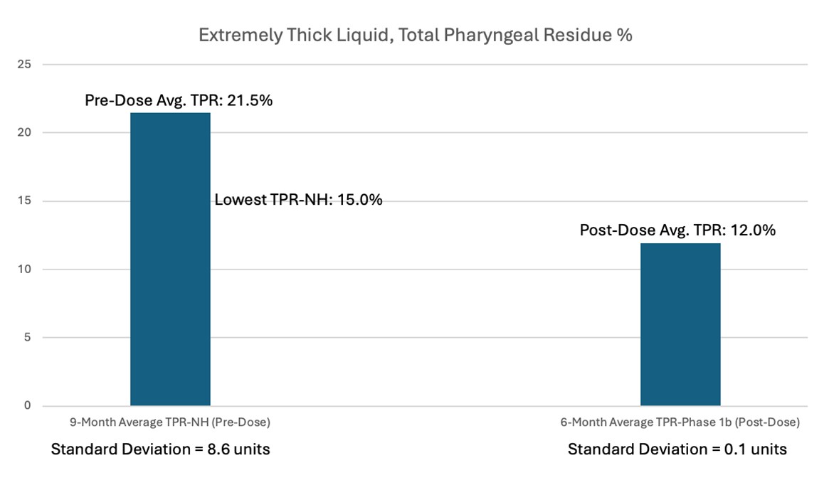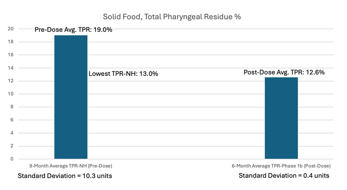 TPR comprises the total amount of solid food or liquid material remaining in the pharynx after the completion of the first swallow of the bolus (Figure 1, from April 2024 R&D Day Slide Presentation). TPR is objectively characterized via the completion of videofluoroscopic swallowing studies which evaluate the complete swallowing process for each subject in the context of four food types (i.e., Thin Liquid, Moderately Thick Liquid, Extremely Thick Liquid, and Solid Food). The consistency of Thin Liquid is similar to that of water. The consistency of Moderately Thick Liquid is similar to that of a smoothie. The consistency of Extremely Thick Liquid is similar to that of yogurt or pudding.