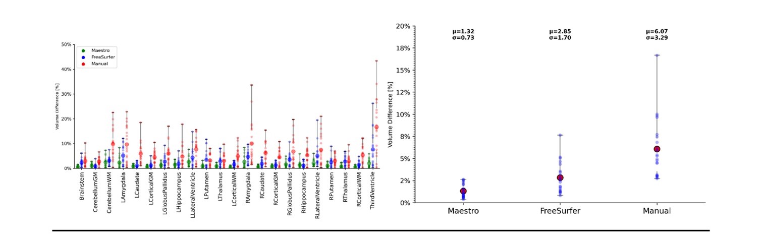 Reproducibility error of Maestro (green), FreeSurfer 7.2 (blue) and manual segmentation (red) for common brain structures (left), and average over all structures (right). Bars represent range of measured relative volume difference.