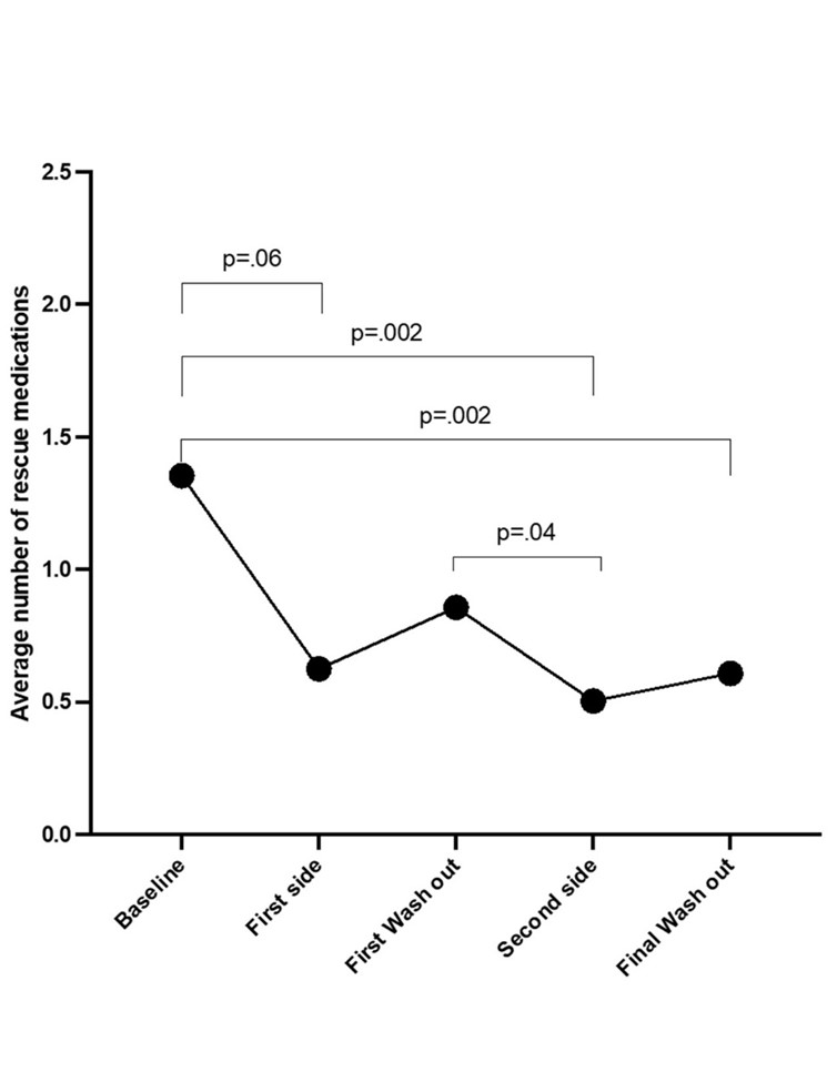 This pilot study (n=41) included patients ≥15 years of age with ongoing GP or FD symptoms for a period of ≥3 months. The primary endpoint was reducing the use of antinausea medications by using nVNS as the primary rescue treatment for nausea exacerbations. Exploratory endpoints included changes in GI, autonomic, and psychological symptoms via standardized questionnaires. The study showed nVNS reduced the use of rescue pills per day by more than 50% (p=0.0007; Figure 1). This benefit was maintained throughout each 4-week treatment period of the crossover study as well as during the two, two-week, washout periods. Exploratory endpoints revealed robust improvements in abdominal pain, reflux, indigestion, and constipation. Depression levels, as measured by the Beck Index, improved, and Migraine scores improved with the subjects using fewer headache/migraine pills per day during the study. No serious device-related adverse effects were reported.