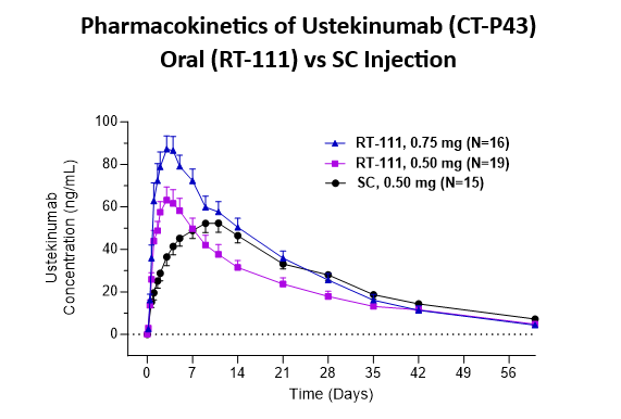 Rani’s single-center, open label, Phase 1 study of RT-111 was conducted in Australia. The study evaluated the safety, tolerability, and pharmacokinetics (PK) of RT-111 in healthy adult volunteers. The study enrolled 20 participants each in RT-111 0.5mg and 0.75mg dose groups, and 15 participants in a STELARA (ustekinumab) 0.5mg subcutaneous (SC) injection group.