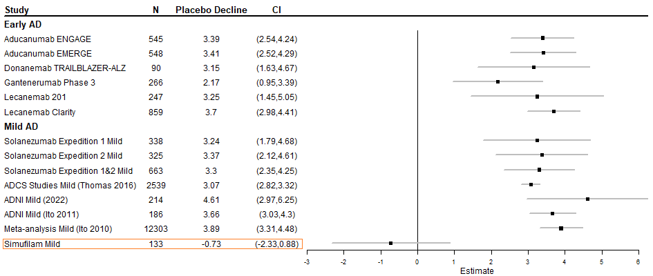 Figure 1: Statistical model of historical 1-year declines on ADAS-Cog, placebo vs simufilam treatment, mild-to-moderate disease.1