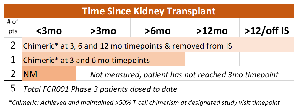 In the Phase 3 FREEDOM-1 study (NCT# 03995901), the first two study patients whose LDKT occurred more than 12 months prior to the data cutoff date were both successfully weaned off all chronic immunosuppression (IS) drugs without evidence of rejection and with stable kidney function and continue to remain off all IS through the data cut-off date. Furthermore, all patients treated at least three months prior to the cutoff date with the Company’s Facilitated Allo-HSCT Therapy, FCR001, achieved T-cell chimerism levels >50% at each of the 3-, 6-, and 12-month timepoints post-transplant. In the Company’s Phase 2 study, establishment and maintenance of >50% donor peripheral T-cell chimerism in an LDKT recipient at 3, 6 and 12 months after administration of FCR001 all correlated strongly with the patient’s ability to durably discontinue chronic IS approximately one year after transplant, without subsequent graft rejection.