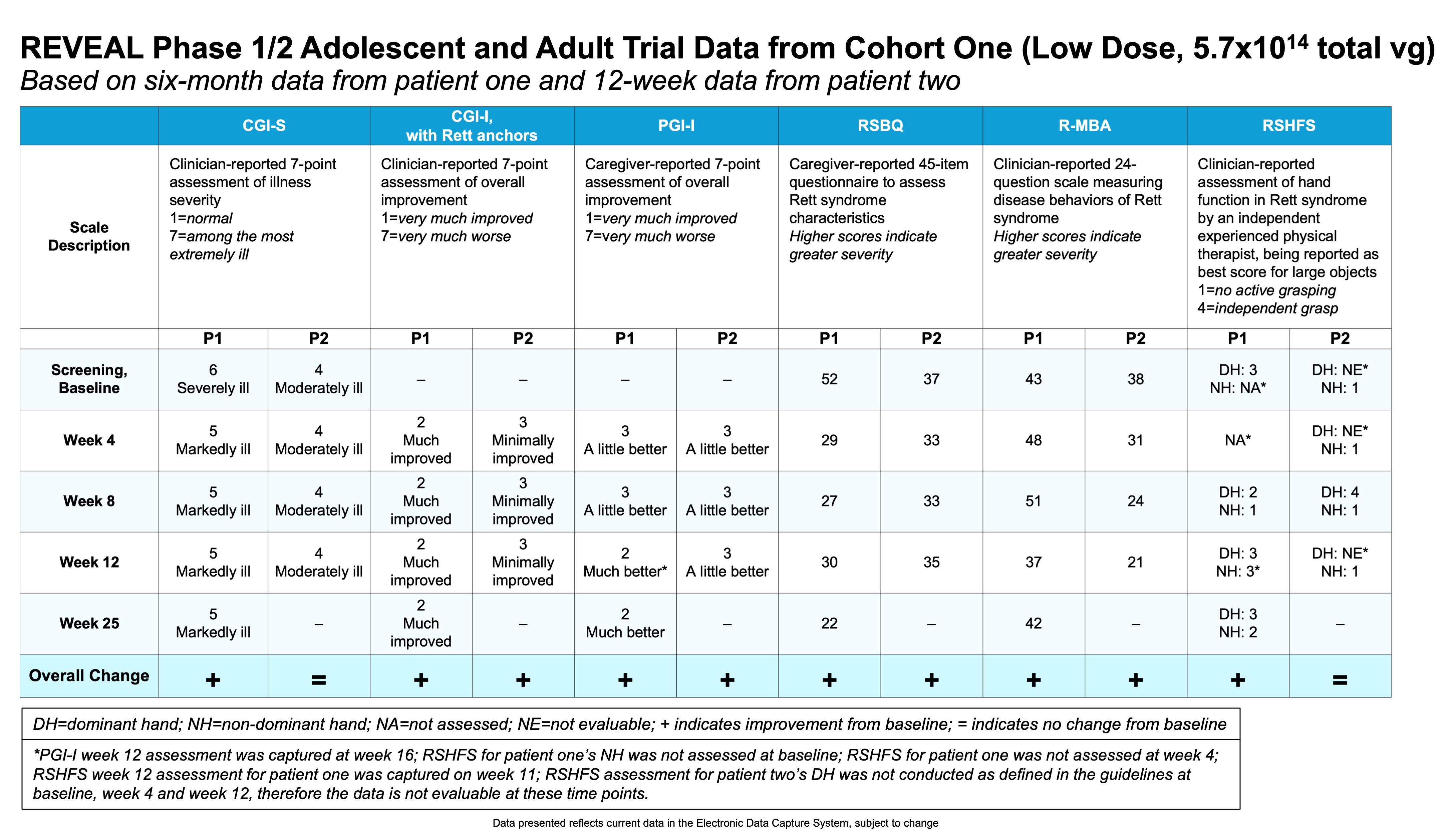 Results from the first patient (large MECP2 deletion; associated with severe phenotype) and second patient (missense MECP2 mutation; associated with milder phenotype) with late motor deterioration stage four Rett syndrome dosed with TSHA-102 in the low dose cohort (5.7x1014 total vg):